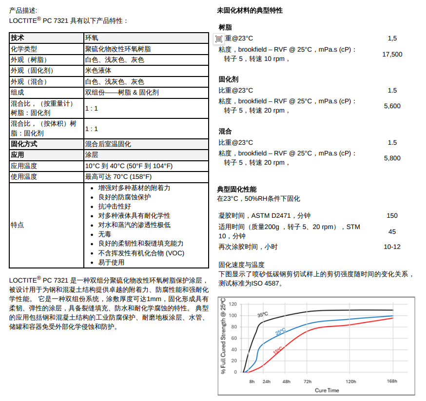 汉高乐泰LOCTITE®PC7321是一种双组分聚硫化物改性环氧树脂保护涂层, 被设计用于为钢和混凝土结构提供卓越的附着力、防腐性能和强耐化 学性能。 它是一种双组份系统,涂敷厚度可达1mm,固化形成具有 柔韧、弹性的涂层,具备裂缝填充、防水和耐化学腐蚀的特性。 典型 的应用包括钢和混凝土结构的工业防腐保护、耐磨地板涂层、水管、 储罐和容器免受外部化学侵蚀和防护。